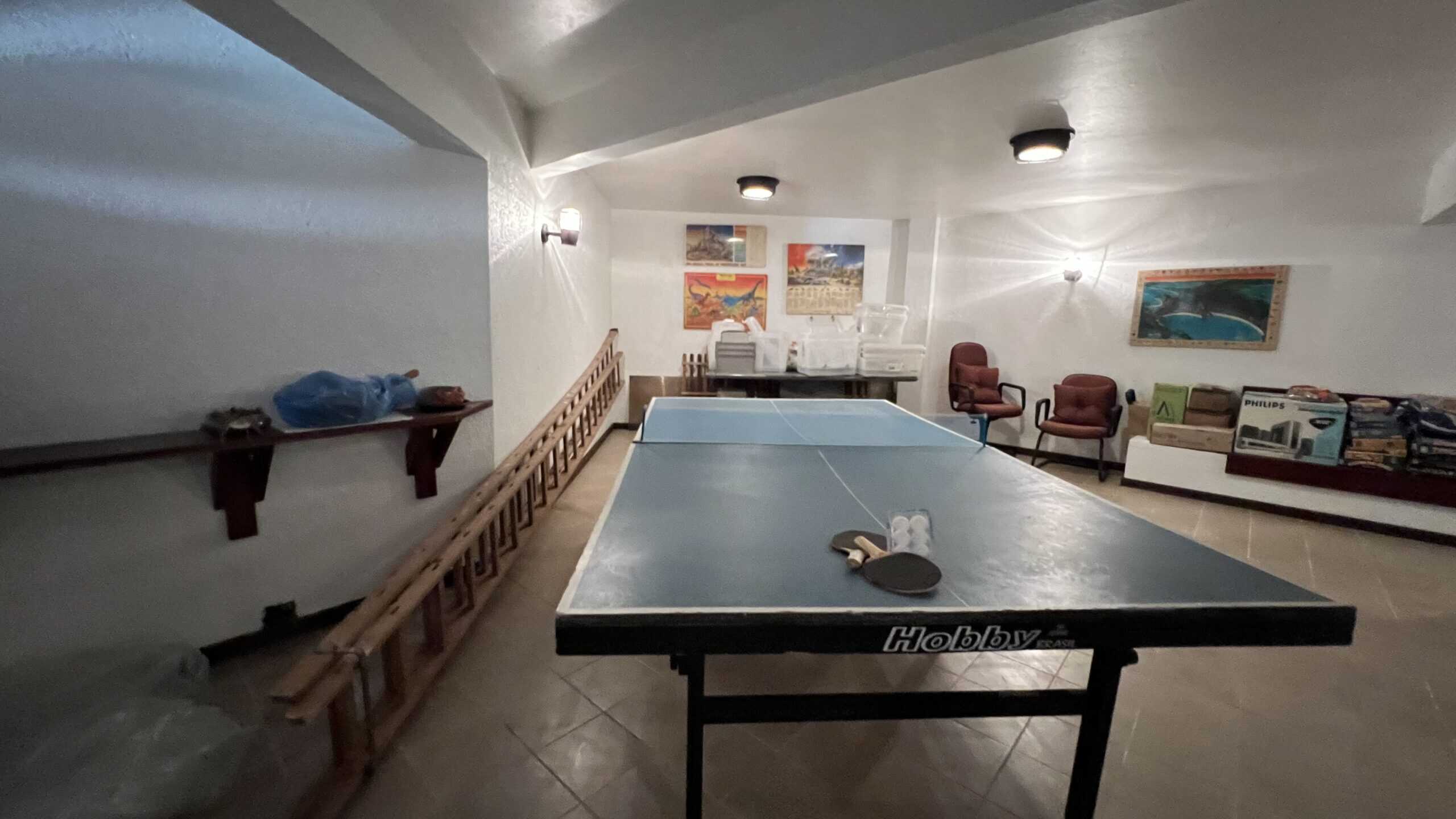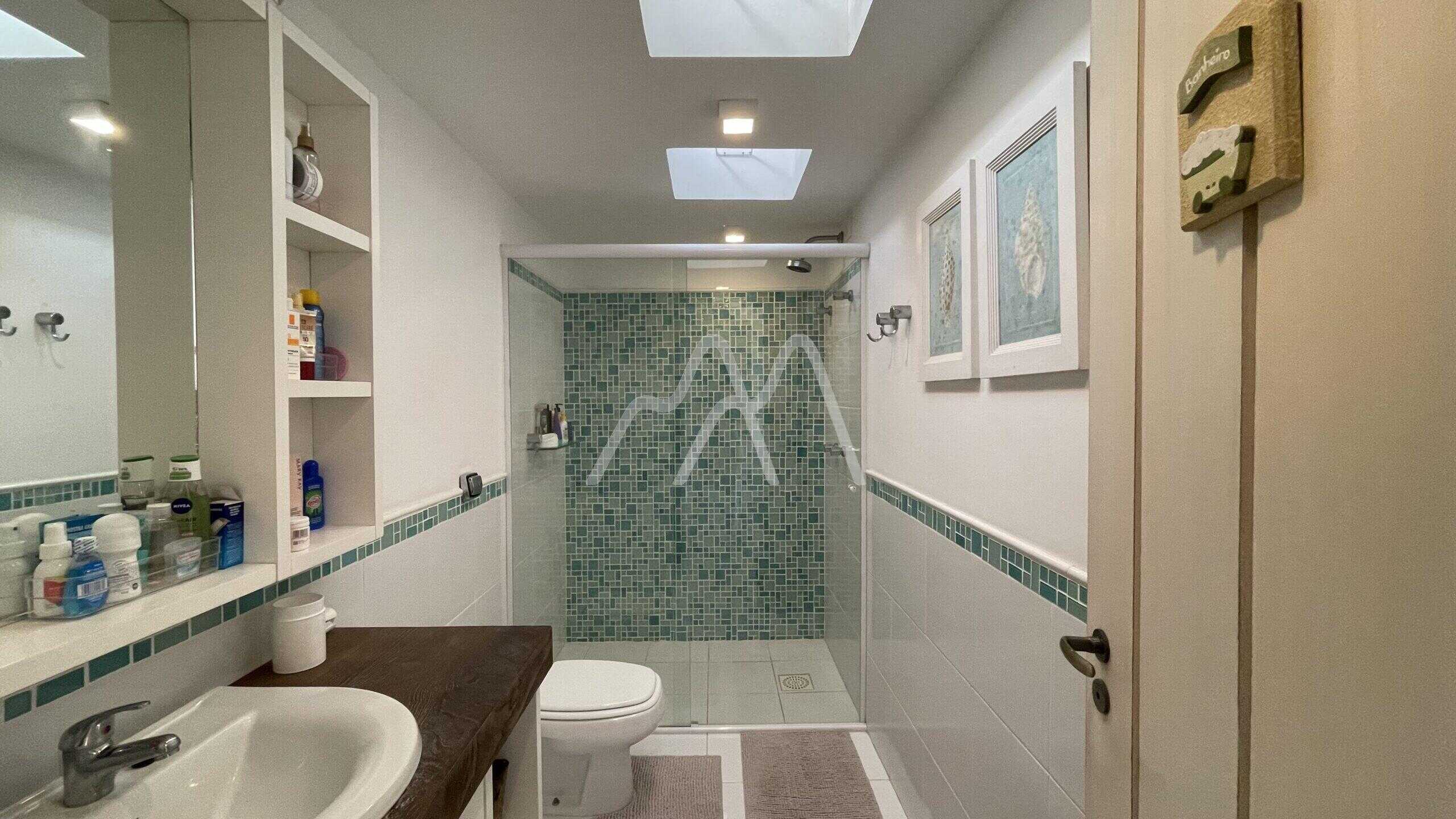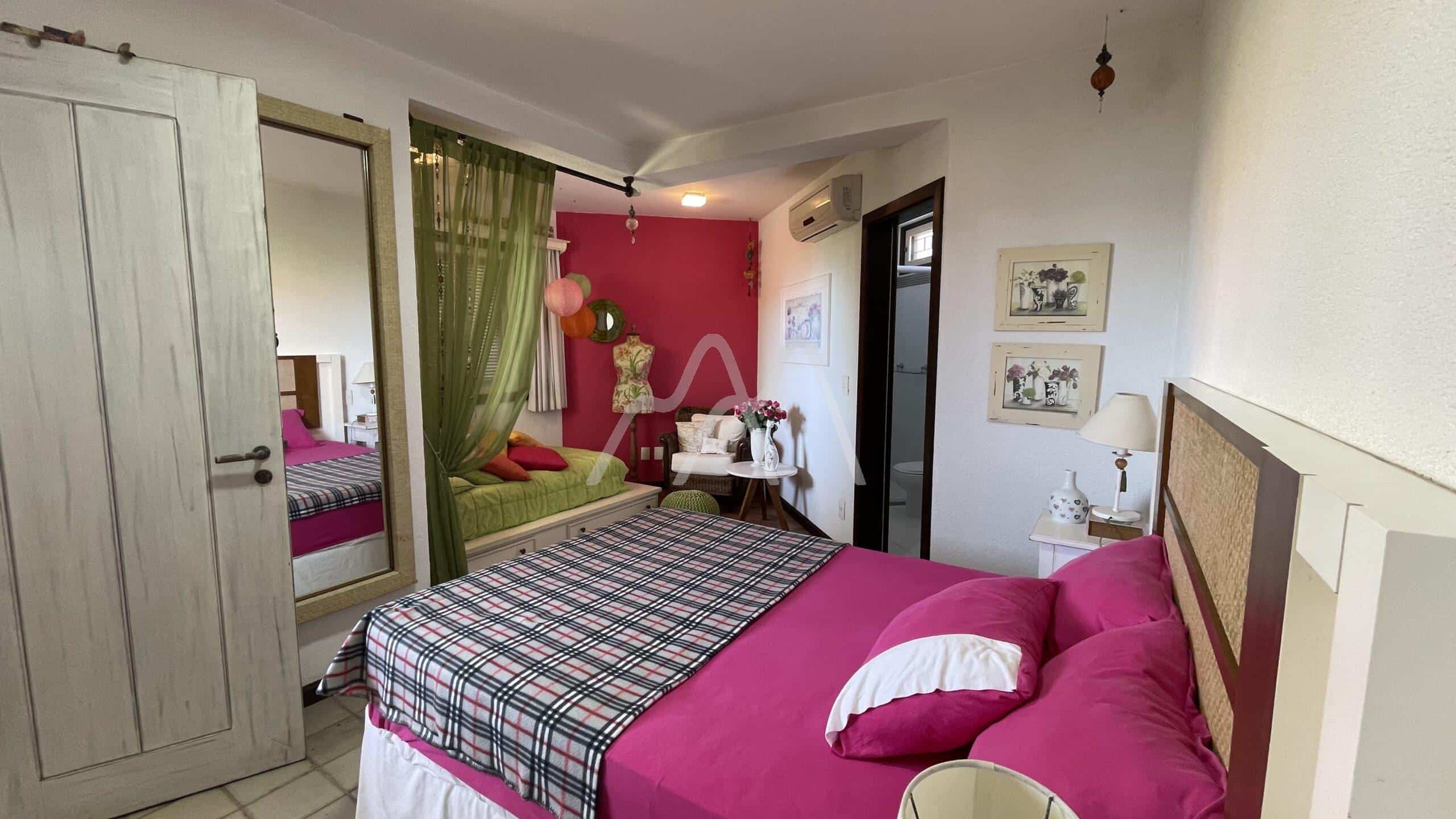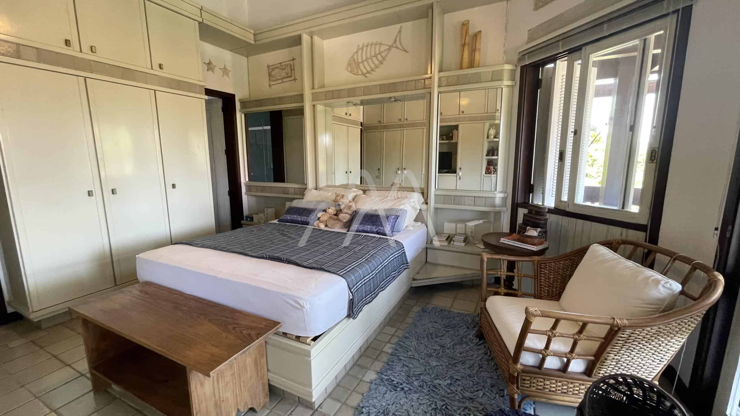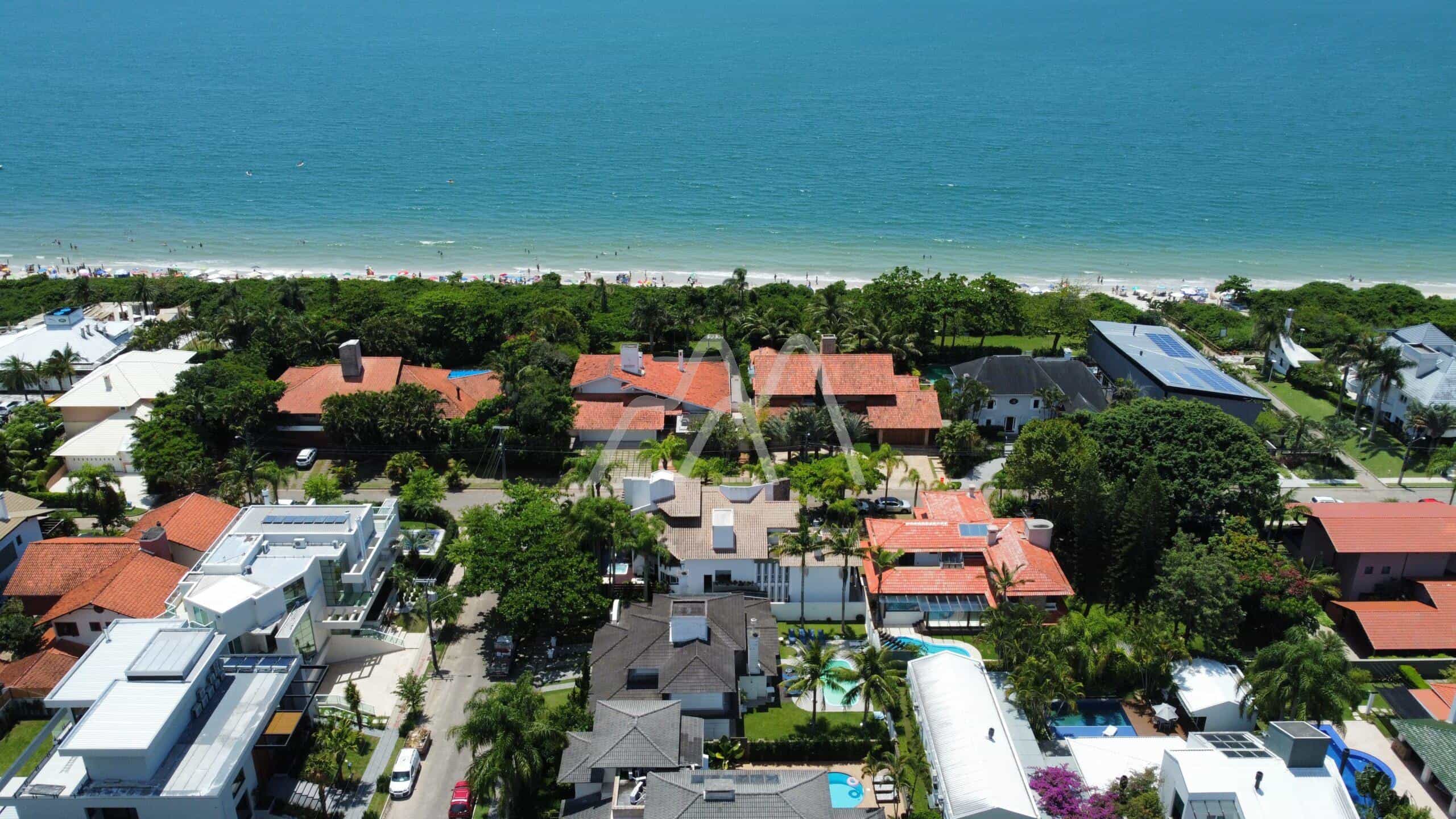 A casa conta com 5 suítes, sendo duas com vista para o mar, além de lavabo, salas de estar e jantar, cozinha, churrasqueira, lavanderia e garagem. Há ainda uma sala íntima, que pode ser utilizada como escritório ou espaço de apoio.