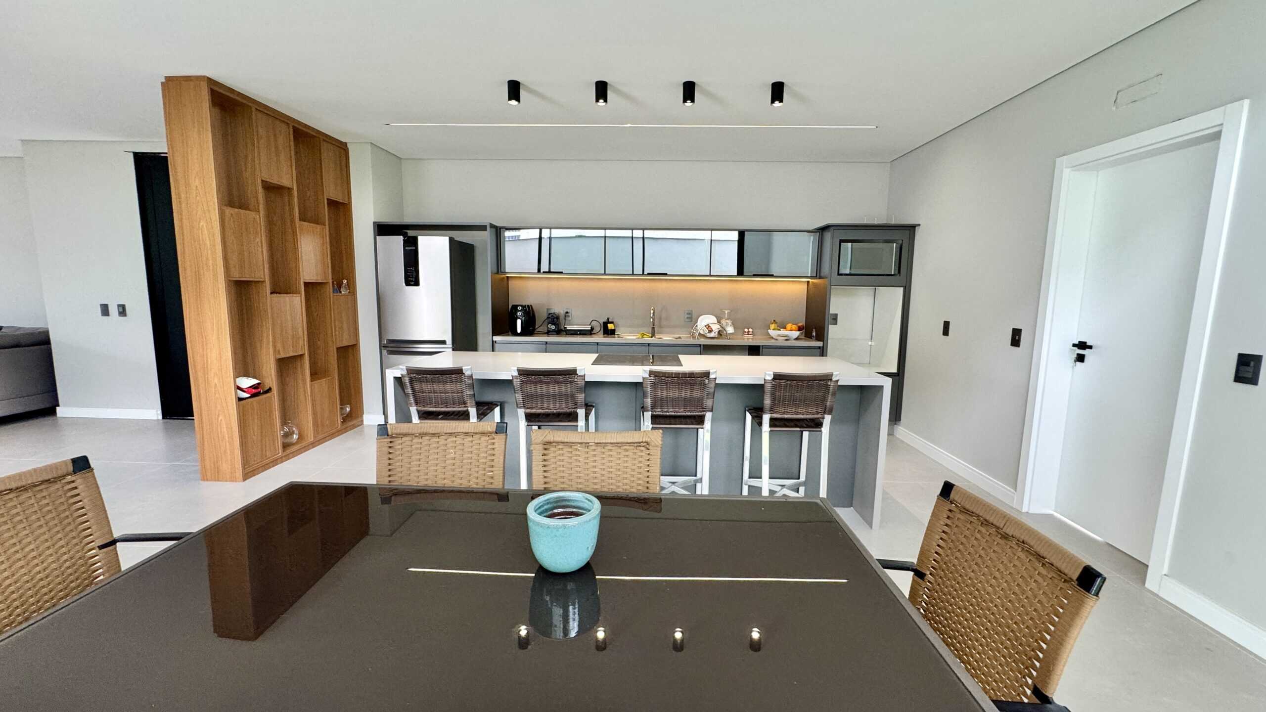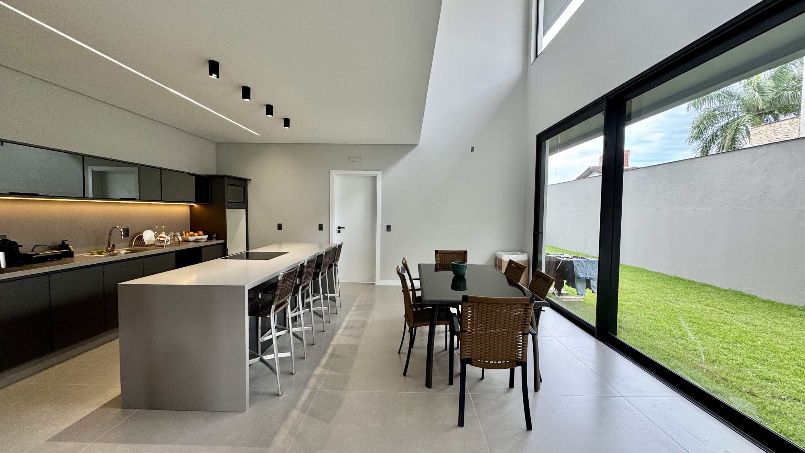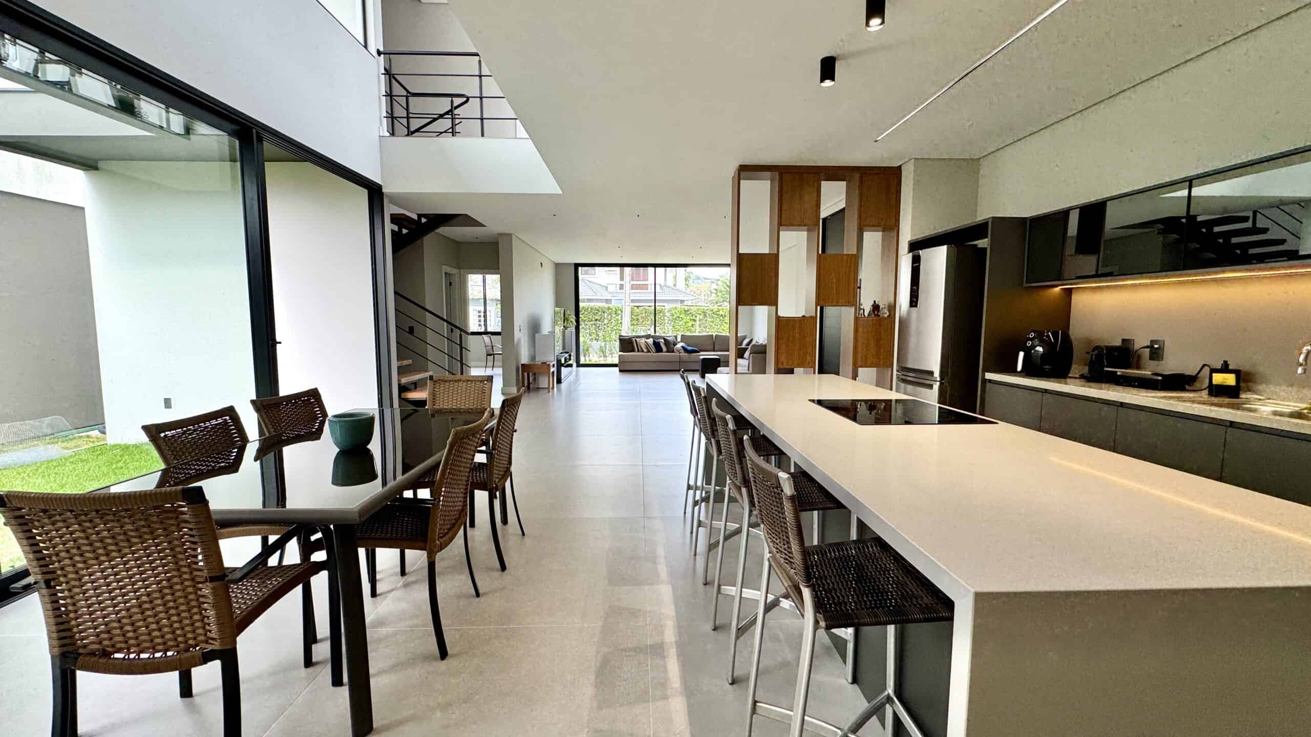 A área social integra living, jantar e cozinha em um espaço moderno e acolhedor, com grandes aberturas de vidro voltadas para o jardim.
