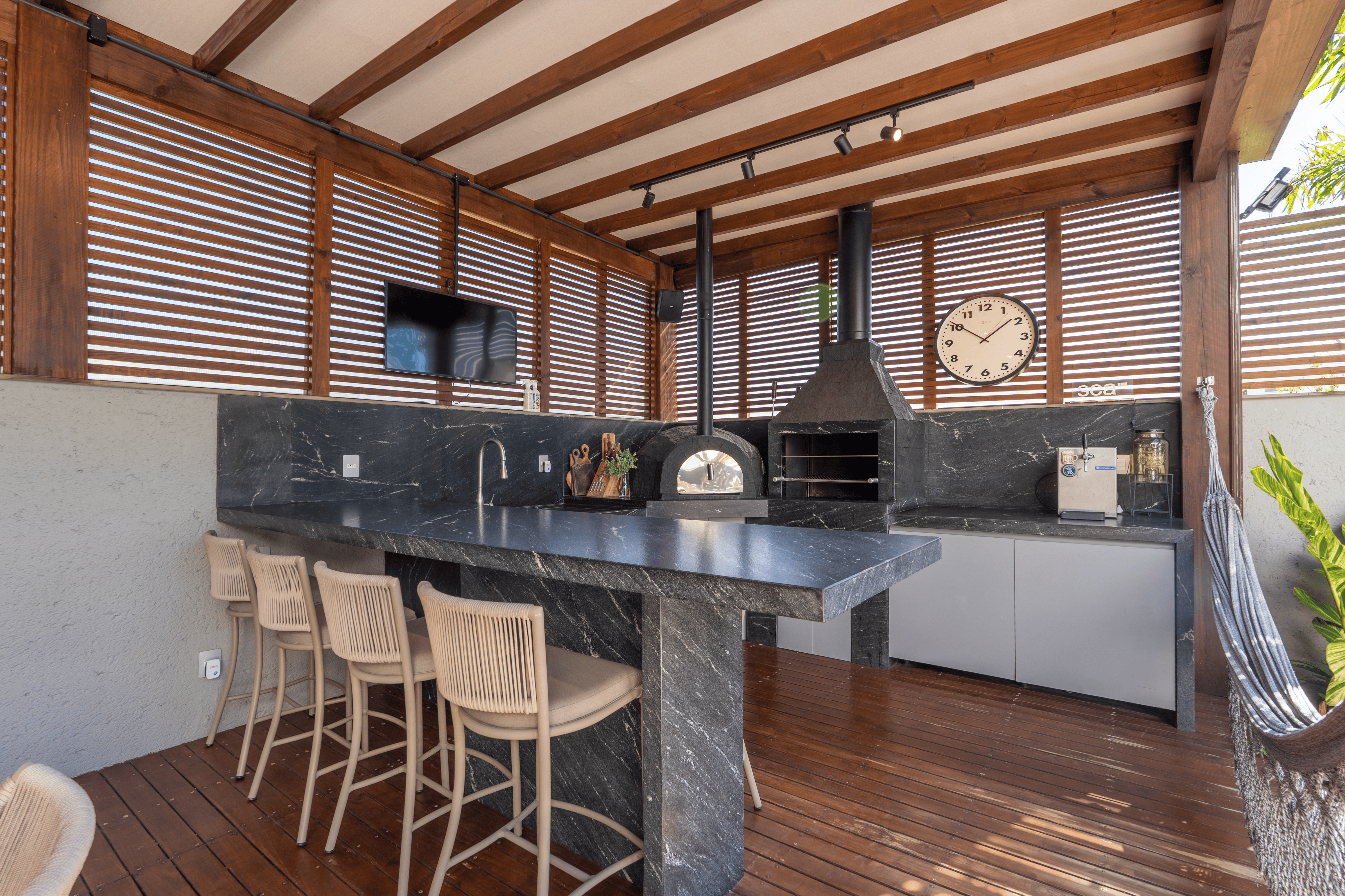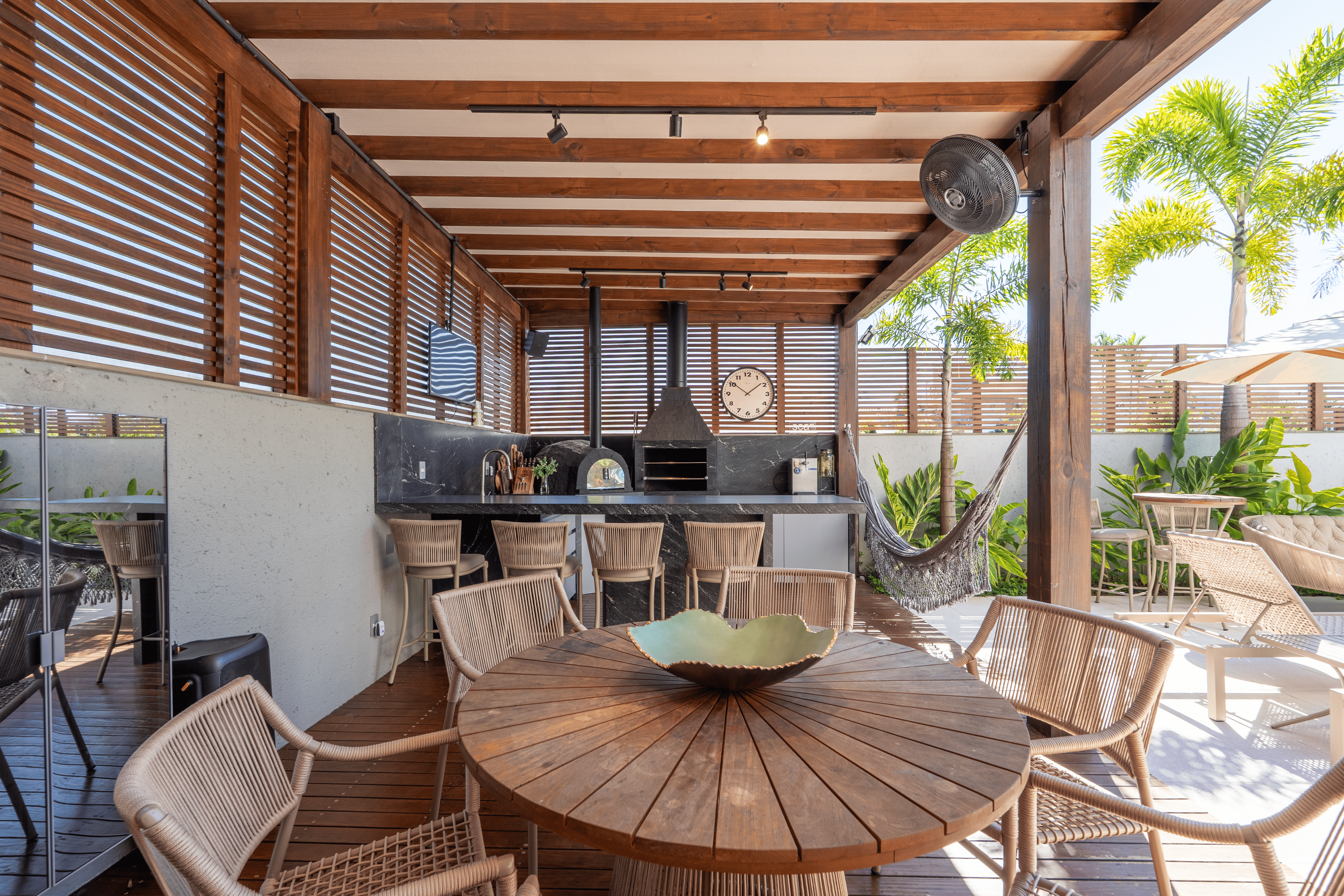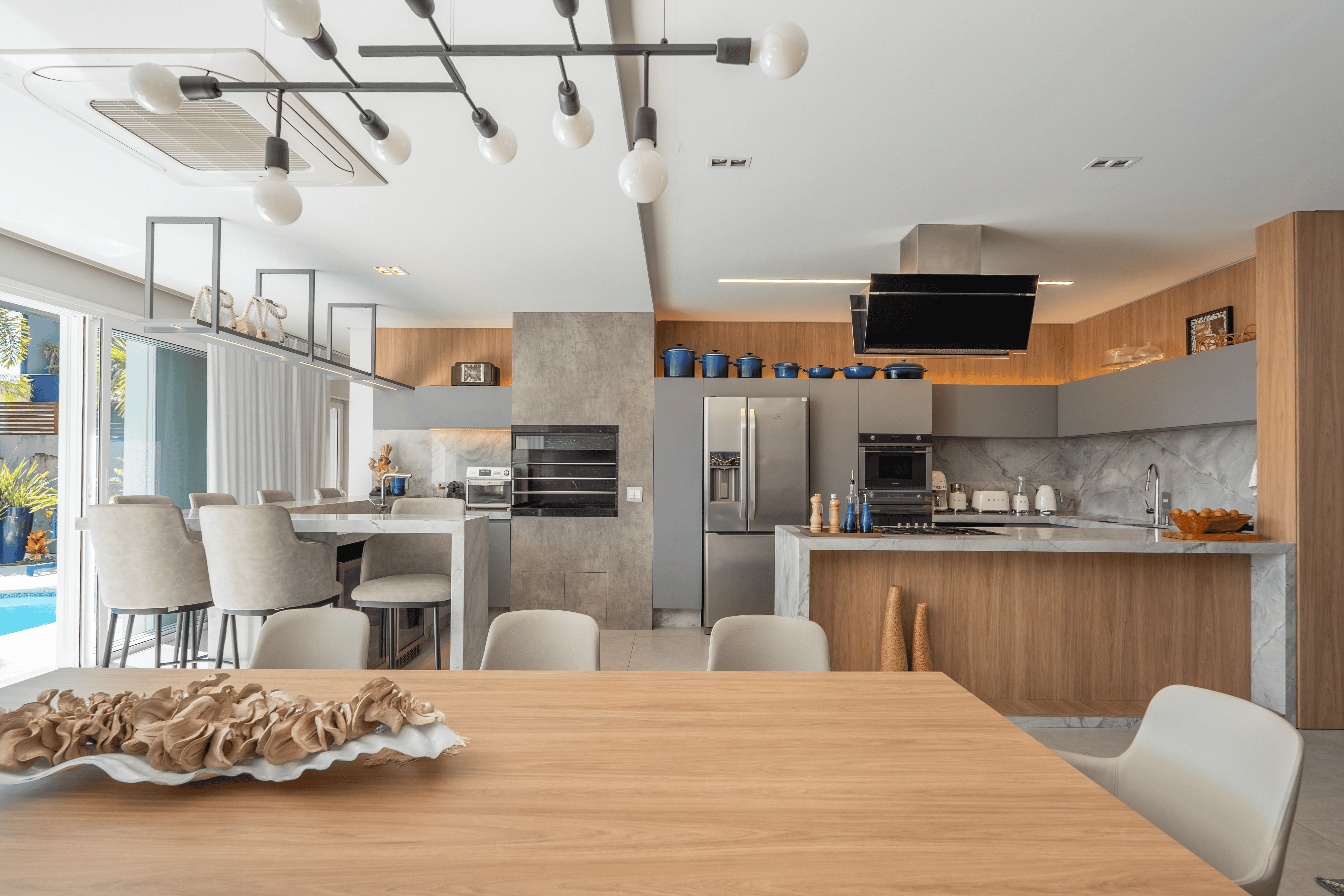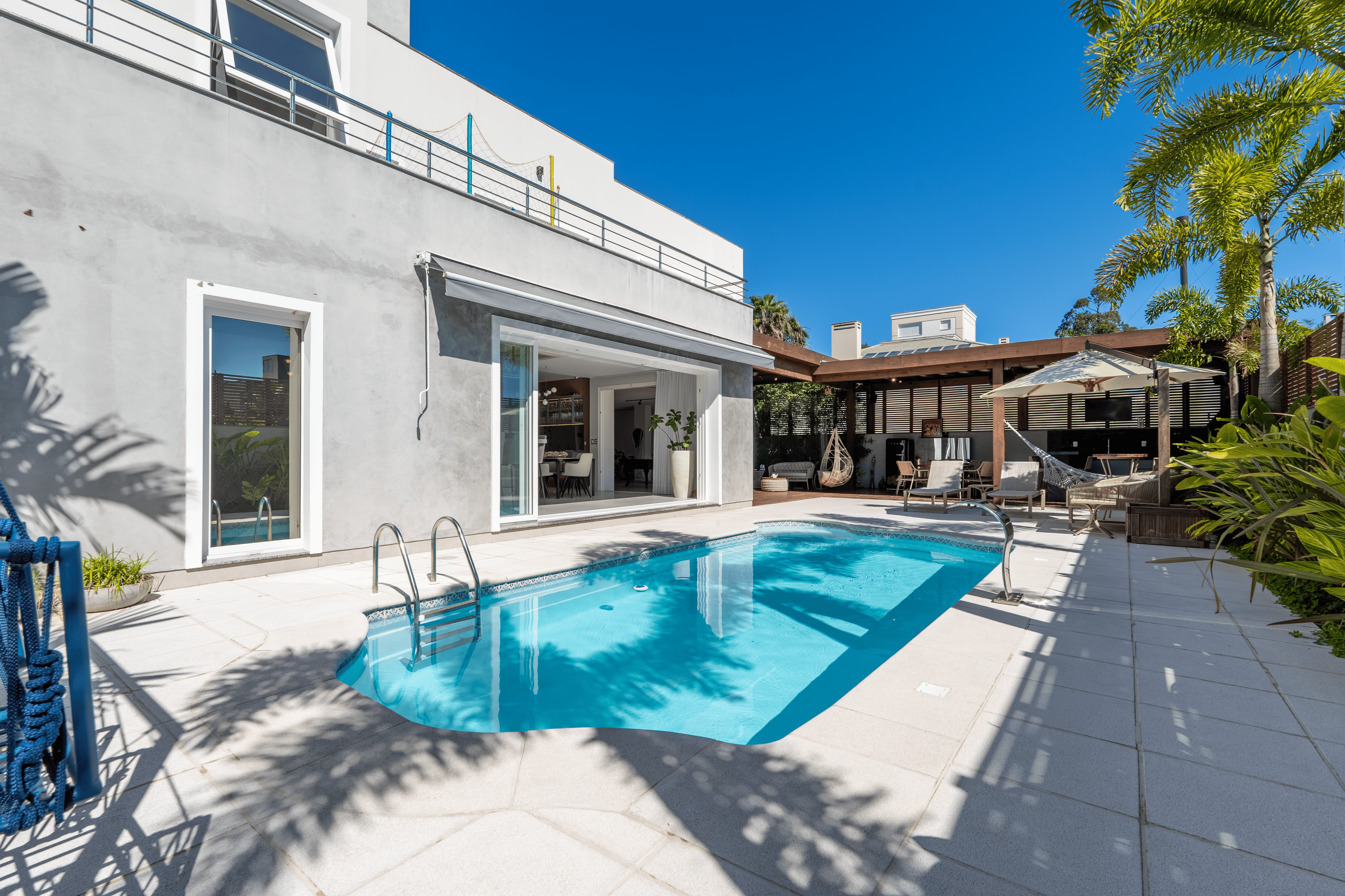 O destaque fica para a área de lazer: um espaço amplo e integrado, com piscina nos fundos, uma varanda generosa voltada para a piscina e uma área gourmet com churrasqueira, criando o cenário perfeito para receber amigos e aproveitar momentos inesquecíveis em família.
