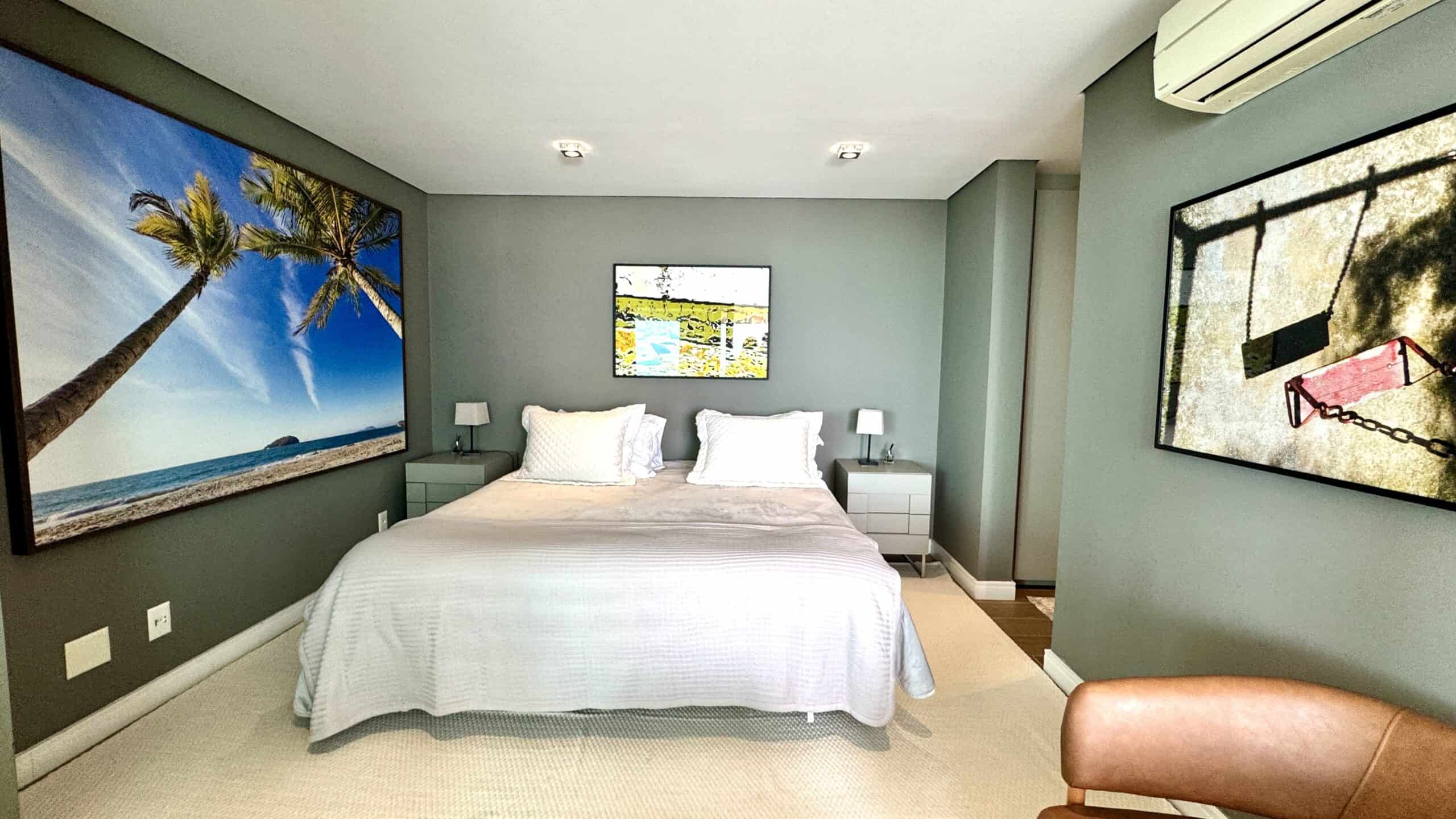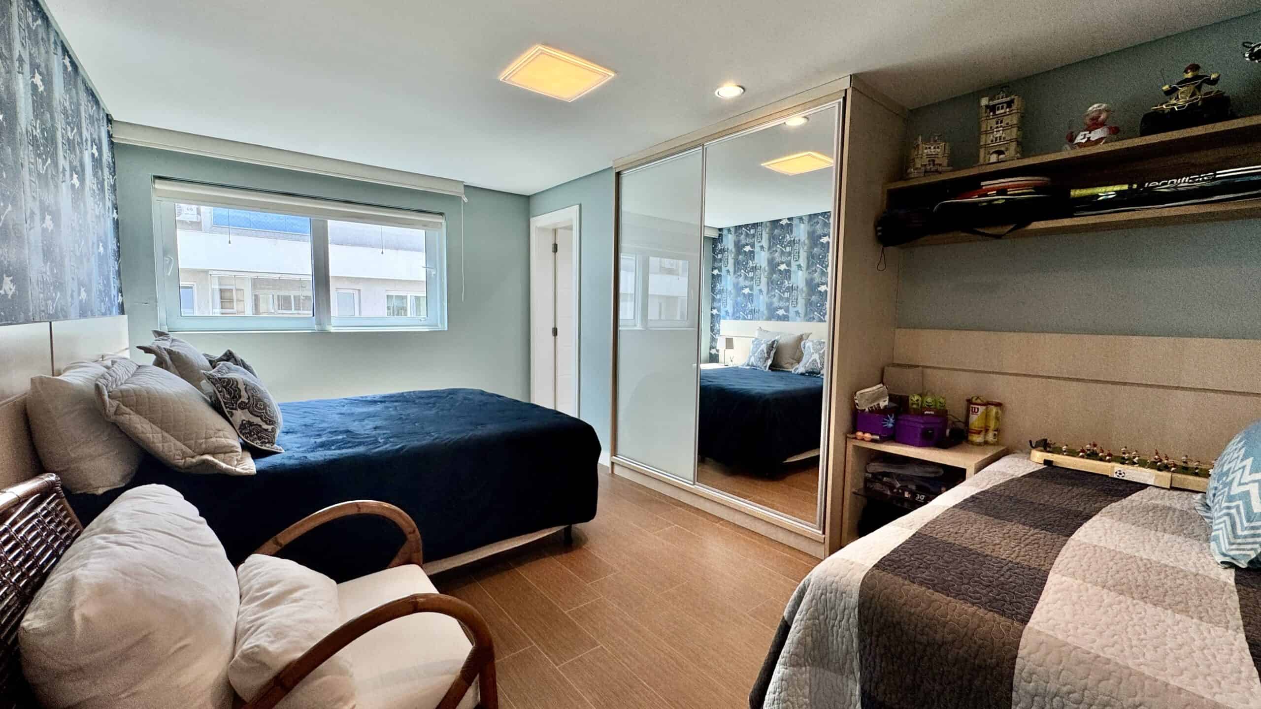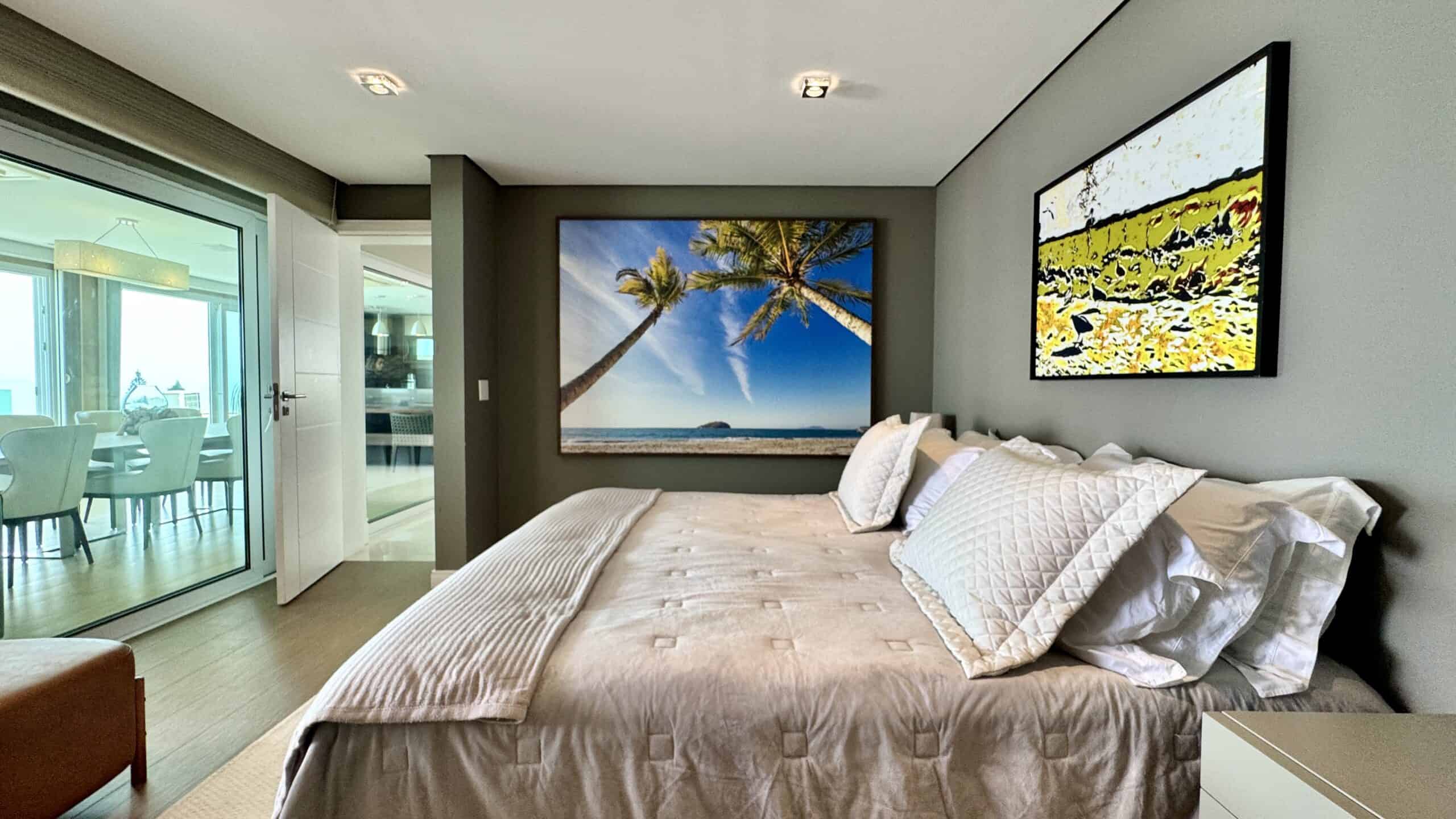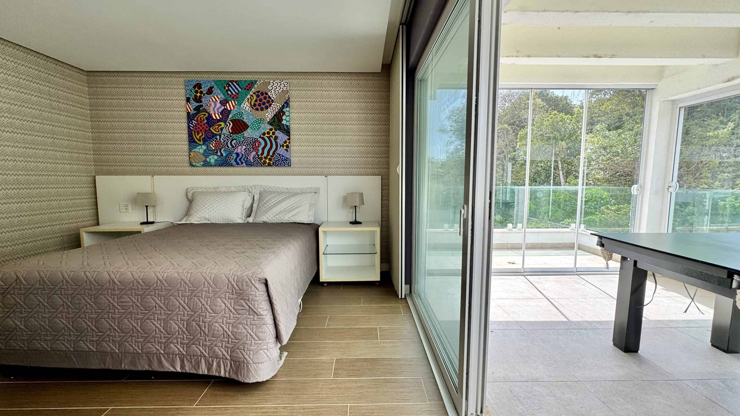Com 311 m² privativos, o imóvel conta com 4 suítes, sendo uma delas de frente para a sacada com vista para o mar. Todos os quartos recebem o sol da manhã, e a suíte principal oferece ainda uma sacada privativa com vista para o verde.